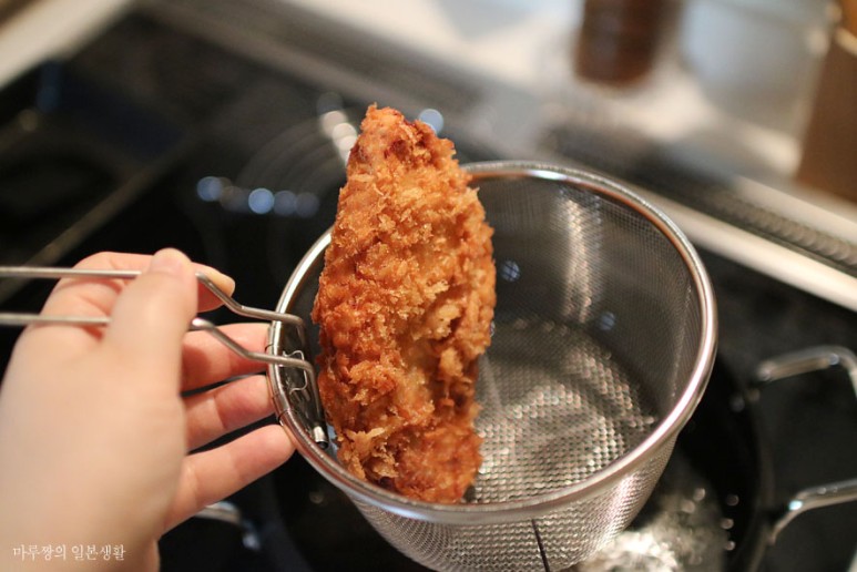 튀긴 돈가츠는 채에 세워서 기름을 잠시 빼주었어요. 확실히 언젠가부터 키친페이퍼에 덩그러니 방치하지않고,