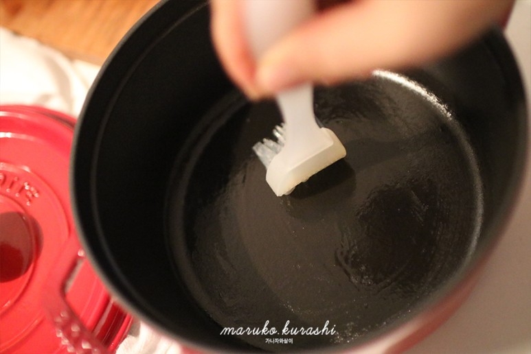 스타우브 냄비는 늘 기름을 발라두고 관리하곤 하는데요, 이날은 기름을 좀 닦아내고 굴밥을 만들었어요.