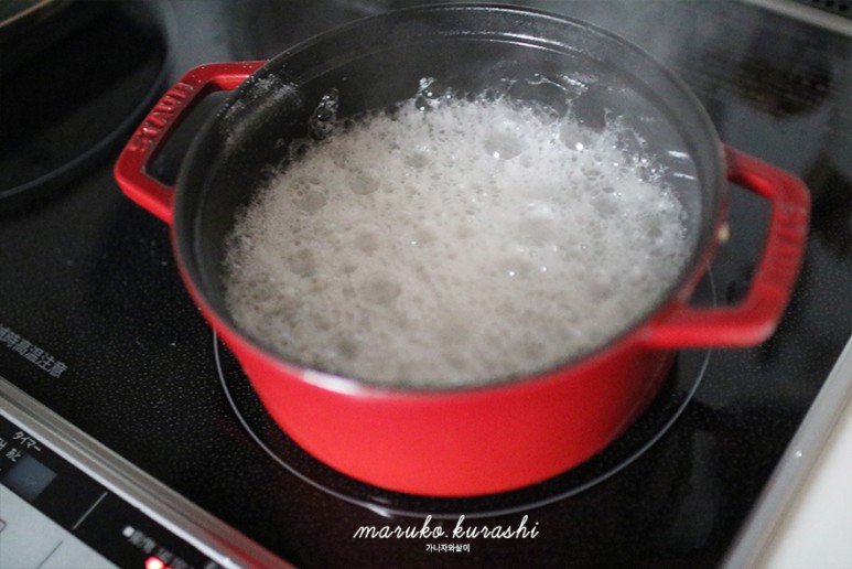 베이킹 소다를 적당량 넣어주고, 끓여줍니다.