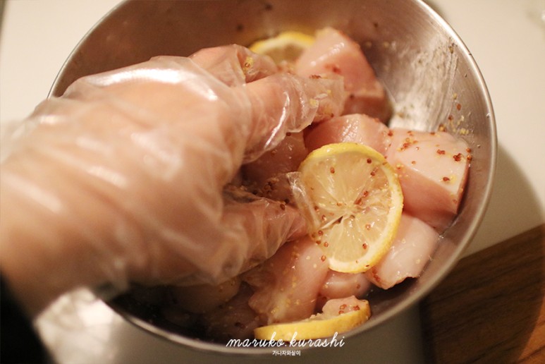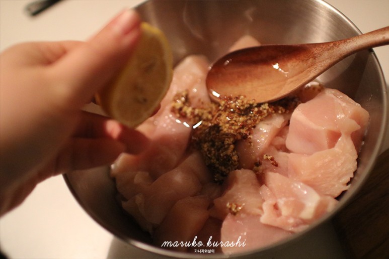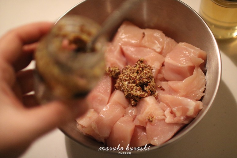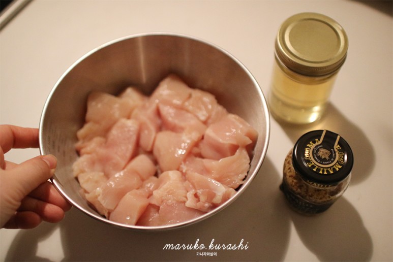 한입사이즈로 썰어둔 닭고기에 홀그레인 머스타드 소스와 아카시아 꿀을 각각 2큰술씩 섞어줍니다.