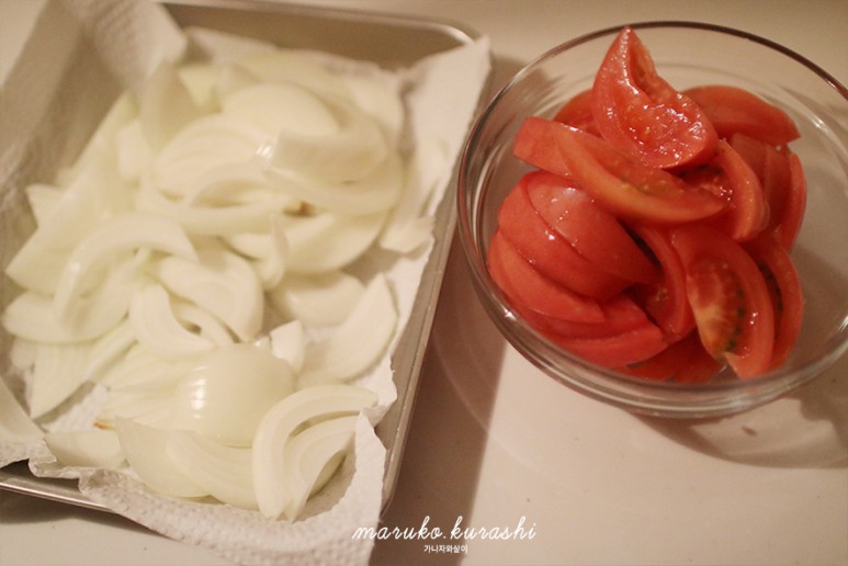 양파는 잠시 키친페이퍼 위에 두어 조금이라도 더 수분기를 빼주고요.