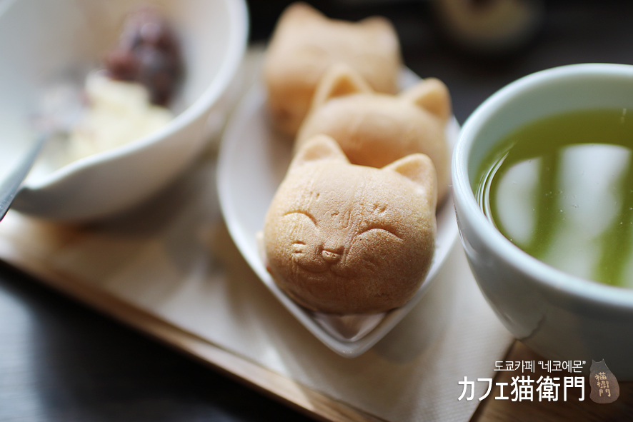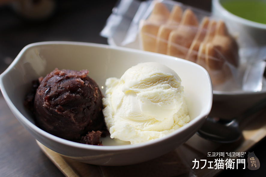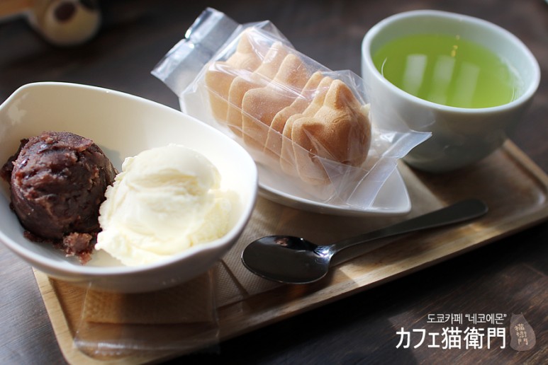 빵~긋, 웃고있는 먹기 아까울만큼 앙증맞은 냥이 얼굴의 과자의 움푹파인 내부에 함께 제공되는 단팥과 아이스크림을 취향대로 넣어 먹는 맛있는 모나카 메뉴입니다. 음료는 녹차로만 제공이 되고, 다른 음료로는 바꾸실 수 없어요. 그냥 녹차로 제공되는 것이 가장 이 메뉴에 어울리는 또다른 특별한 점이 아닐까 싶습니다.