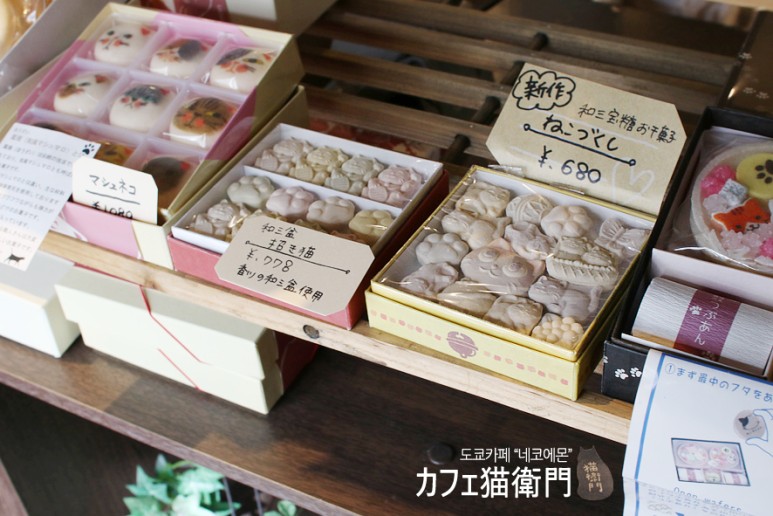 가게 내부에 진열되어있던 귀여운 고양이 스위츠. "연결고리" 라는것에 대한 위대함이 느껴지는 순간. 이렇게 조금씩 판매를 하고 있긴하지만, 마네키네코야나카도, 네코에몬 카페, 그리고. 별도의 스위츠점. 이 세 지점은 각각 팜플렛에서 서로를 소개해주고있고, 야나카도에서도 상품을 구매한 우리에게 사장님은, 바로 옆집인 스위츠 카페를 소개해주고 있습니다.