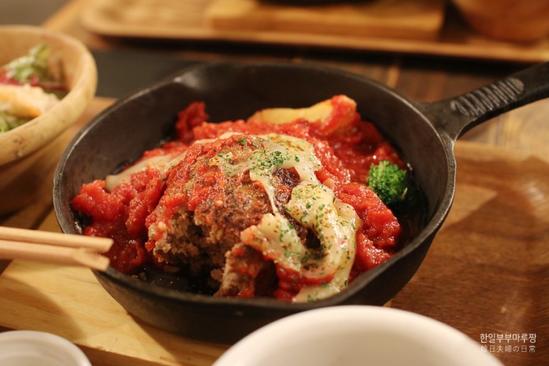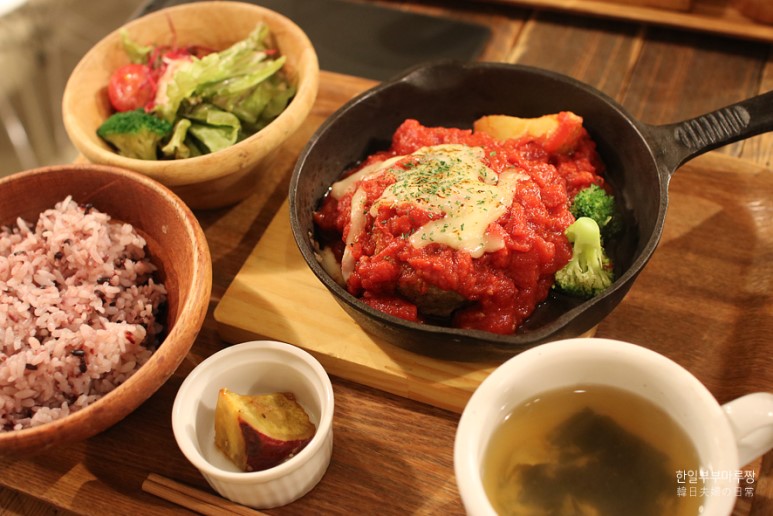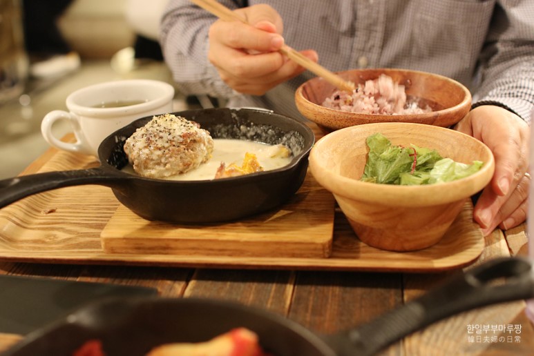 런치였다보니 남편과 음료가 포함된 드링크 런치세트를 하나씩 주문했어요. 예전에 친구들 모임으로 왔을때에는 밥, 반찬 류로 주문을 했었는데, 이번에는 왠일인지 둘이 함바그에 꽃혀 남편은 크림소스 함바그, 저는 토마토 소스의 함바그 세트를 주문하게되었습니다.