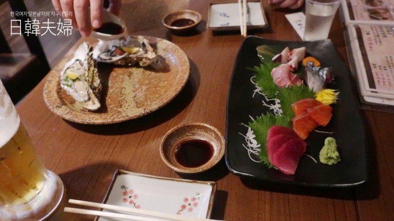 남편과 저는 포커페이스로, 정말 먹고싶은것만 딱딱 골라 먹었는데 말이예요. 생굴, 그리고 굴 튀김, 그리고 사시미 모리아와세,