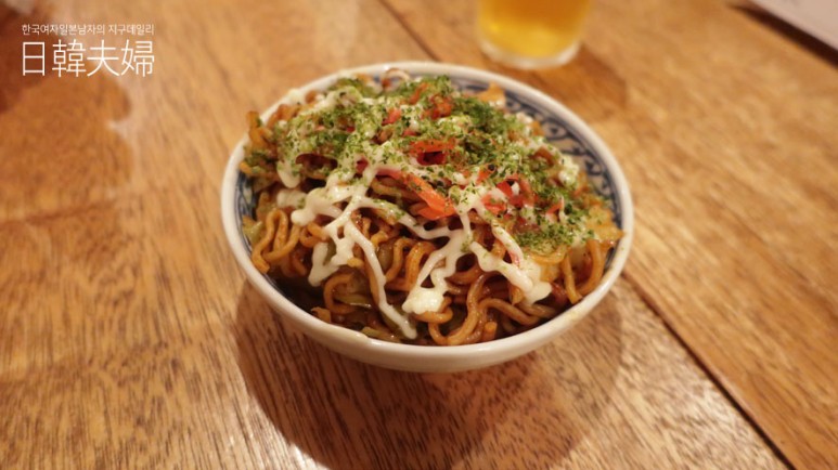 작은 공기밥 그릇 사이즈에 나오는 적당한 양의 소스 야끼소바, 평범한 야끼소바의 맛이라 작은 잔에 따라먹는 병 맥주의 맛과 너무나도 지극히 잘 어울리는 맛.