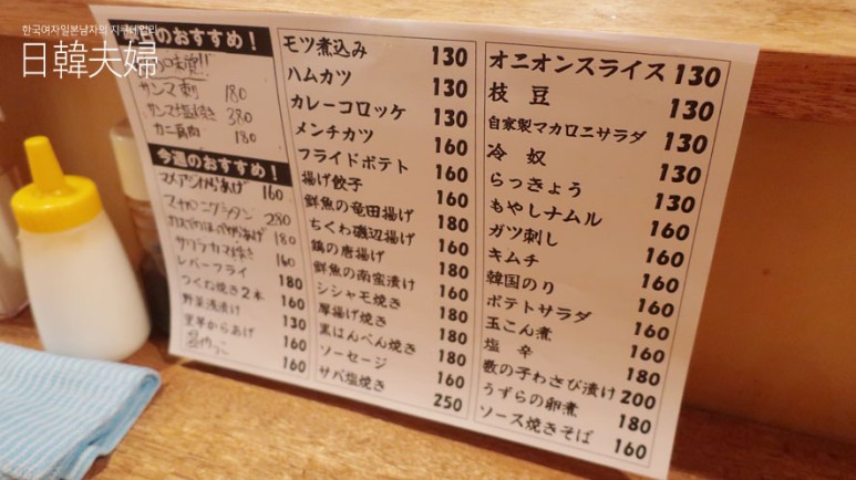 메뉴를 보시면 아시겠지만 일부 몇개만 빼고는 모두 200엔 이하로 드실수가있습니다. 저희, 병 맥주 1개에 이런저런 메뉴 배속 가~득 채우고도 한국돈으로 1만원 조금 넘었다라는 불편한 진실... ㅎㅎ 말도안되는 금액이 나와서, 그리고 주문하면서도 참 기가차고 어이가없어서 남편도 저도 계속 "얏쓰~!" "얏~쓰!" 라고 중얼중얼 거리며 서로 웃음 밖에 안나왔어요.