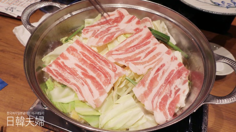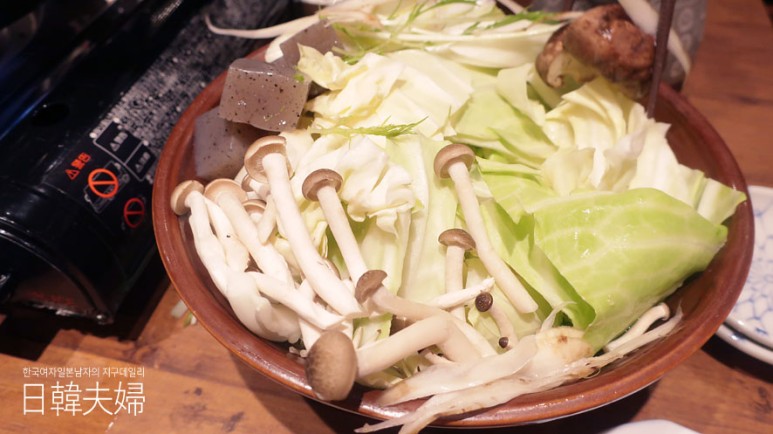 저희는 먼저 넣었던 동글 츠쿠네 당고와 함께 곤약, 버섯 등을 차례대로 넣기 시작했어요. 사실 재료들이 나중에는 양배추까지 모두 쏟아 넣은 뒤에, 또 함께 주문한 흙돼지창코 재료들도 위에 얹기 시작했죠.