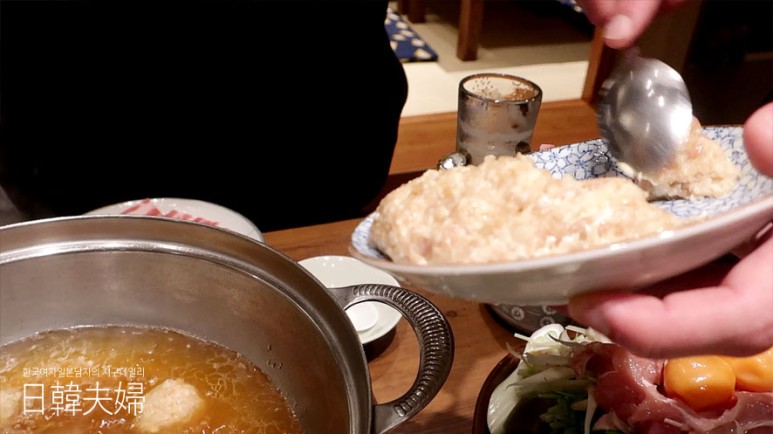 아무튼 나베에 기본 스프를 담아 세팅을 해주시고, 이 남자 직원분이 손수 모든 테이블에서 기본적으로 츠쿠네를 스픈으로 멋지게 만들어내주십니다. 접시에 담겨있는 손질된 고기들을 스푼으로 촤자작- (???_) 움직이셔서 동그란 당고를 만든뒤 나베 속에 퐁당- 빠뜨려주시는 작업까지만 도와주시는데요,