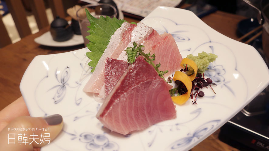 이곳에서 먹는 방어 사시미를 먹으면서 이야기가 나온것은, 저희가 신선하고 양이 많은 회를 저렴하게 먹는데에서 엄청난 만족감을 가지고 늘 방문하는 신바시의 우오킨에서 제공되는 사시미의 사이즈와 굉장히 닮아있어다는 것이었어요. 크고 넓직 했다 라는 것이죠. 보기에는 에게~4장 5장 으로 보이지만, 굉장히 도톰하고 큰 사이즈로 780엔이 아깝지 않게 맛있게 먹었다는 결론입니다.