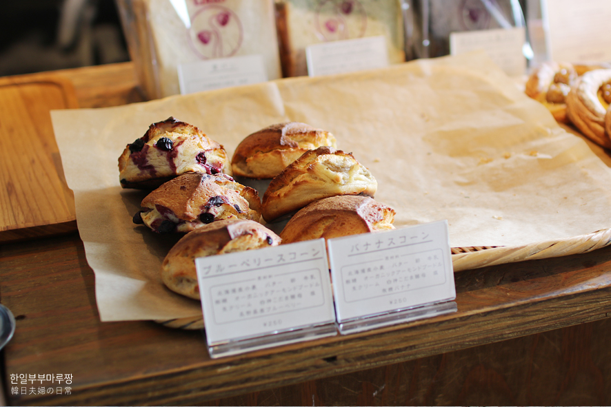 지금까지 내가 살면서 먹어왔던 스콘들은 이가 부러지도록 단단한 것들이었고, 목넘김이 매우 건조하고 풍부한 맛과 향을 느끼기란 정말 어려운 메뉴중 하나였어요. 저희가 들어갔을때에는 손님이 아직은 저희밖에 매장에 입점하지 않은 상태였고, 남편과 저는 좋은 주문을 하기위해 어서 주변에 진열된 빵들을 스캔해야했죠. (웃음) 야키소바빵도 보이고, 흠, 내가 아직까지는 완벽하게 맛있게 먹어본적이 없는 조금은어려운 메뉴 "스콘" 도 자리잡고있었어요. 뭐 하나정도 먹어볼까? 하다가 주인언니께서 하시는 말씀,