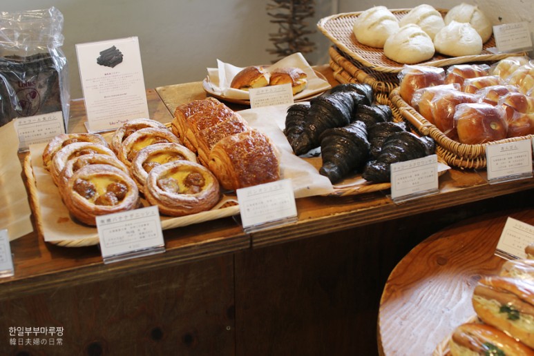 향기로운 빵냄새와 미소를 잃지않는 여 주인. 무엇보다도 눈에 쏙 들어오는 까맣디 까만 크로아상, 오징어먹물인가 ? 뭐지? 하고 엄청난 궁금증을 유발했습니다. 알고보니 홋카이도산 밀가루 반죽을 원료로 만든 "건강 숯 크로와상" (250엔)