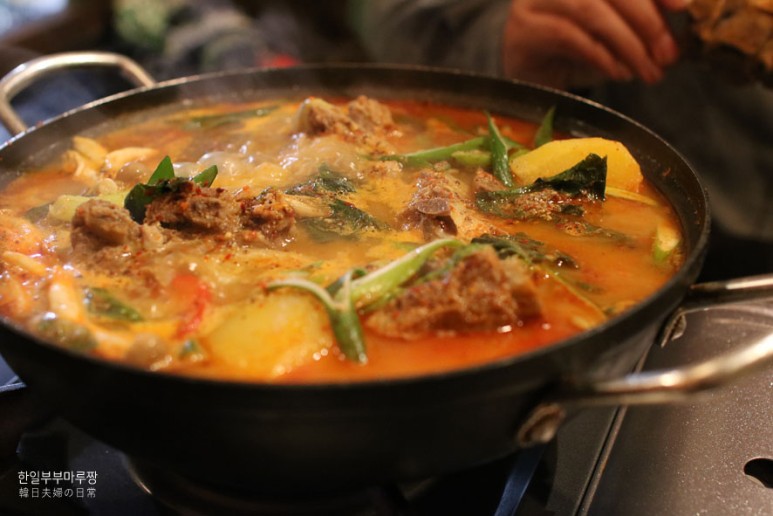 드디어 기대하던 감자탕이 테이블에 제공되었어요. 비쥬얼 끝내줬죠..! 너무 예쁘게 잘 담겨나오는것 같았는데. 가게 통털어 감자탕 주문한 테이블은 저희밖에없었더라구요. 사람들이... 먹을줄을 모르네....(농담) ㅋㅋ 너무나 허기가 져있기도했고, 어서어서 이 일본이라는 나라에서 얼큰하고 따깐따깐한 감자탕의 찌~인한 국물 한스푼 마셔보자꾸나, 라며 보글보글 끓기를 오메불망 기다리기♡