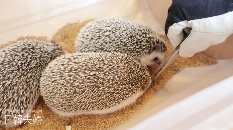 카페에 있던 고슴도치 중에는 정말 이렇게도 큰 고슴도치가 존재하는가? 라는 의문이 들정도로 신기한 사이즈의 고슴도치도 있었어요. 고슴도치는 손을 소독한뒤에, 테이블에 준비된 장갑을 끼우고나서 밥을 주거나, 만지거나, 들어보거나 한답니다.