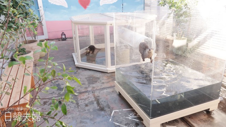 자, 마지막으로는 카페의 초 절정 귀염둥이, 수달 친구를 만났어요. 이 카페의 테라스에 넓다란 수조 안에서 방방 뛰며 돌아다니며 놀던 3마리의 수달 친구들, 사료처럼 생긴 간식을 줄 수 있었는데요, 수달친구들의 집 벽면에 뚫린 원형 구명으로 수달친구들이 간식 나에게 달라며 애교에 애교에 난리도 아니었던 낑낑~ 거리는 소리를 들으며, 정말 누구에게 사료를 줘야할지 눈물을 머금고 애간장 태우며 한알한알 차근차근 넣어 주는 시간이 계속되었어요. 사료는 사실 5알을 제공받았거든요.