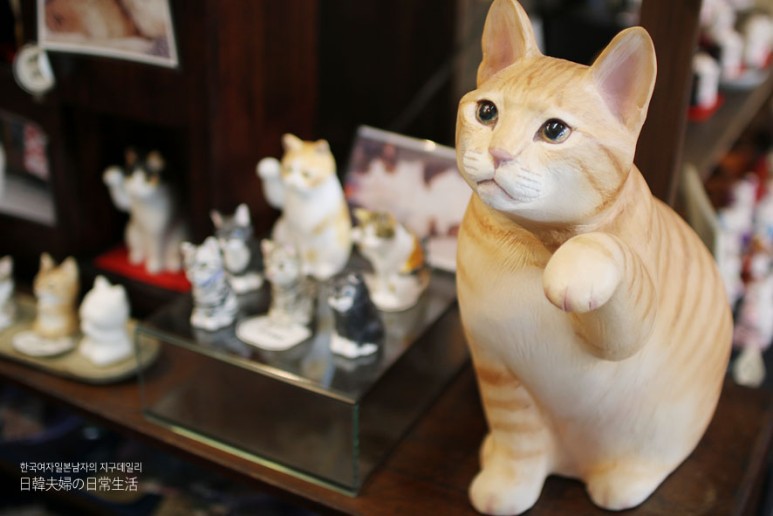 야나카도 상점내부에서는 다양한 마네키네코 디자인들이 판매되고 있으며, 고양이 동상및 미니어쳐 상품들, 그리고 자신의 생일과 관련된 마네키네코 악세서리도 접할 수가 있어요. 컵, 나무로 만든 쟁반 기타 등등. 역시나 수십년이 넘은 집을 개장하여 이렇게 마네키네코 숍으로 운영하고 있는 것 같습니다.