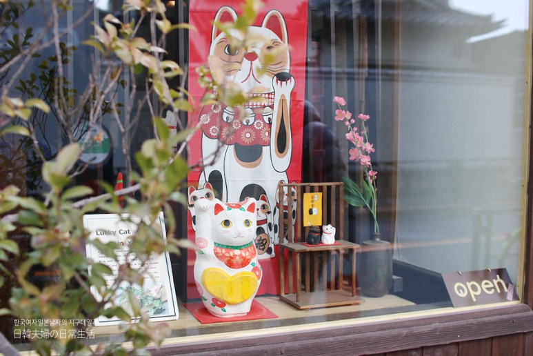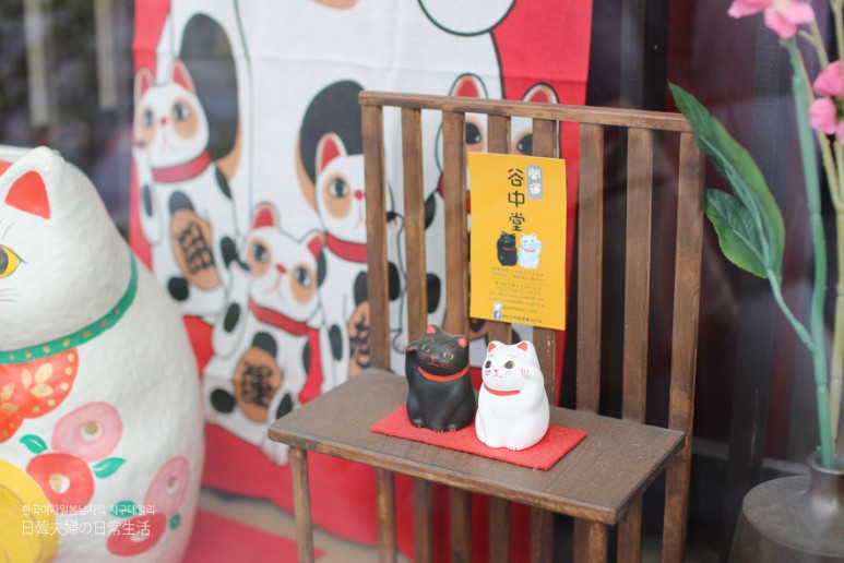 바깥 디스플레이에 진열 되어있던 조그마한 마네키네코 소품은 반드시 매장 안에 있을거라는 확신이 들더군요. 눈코입은, 사람이 직접 그린것 같은 느낌이었어요. 왼손과 오른손을 번갈아 가며 들고 있는 귀여운 마네키네코를 보니 한시라도 더 빨리 매장안에 들어가고 싶은 욕심이 흘런 넘치더군요. 길거리에도, 그리고 가게에도 아무도 없는 남편과 나, 우리 둘뿐.