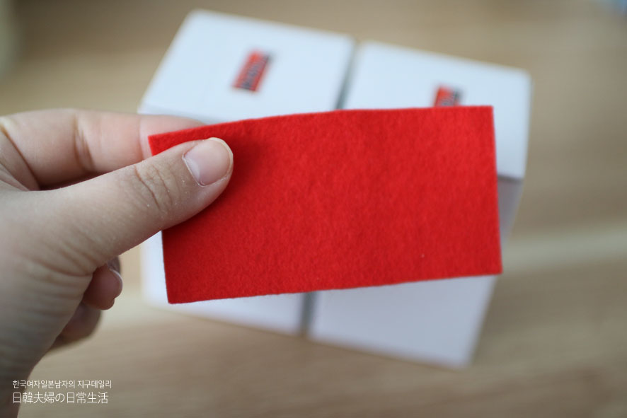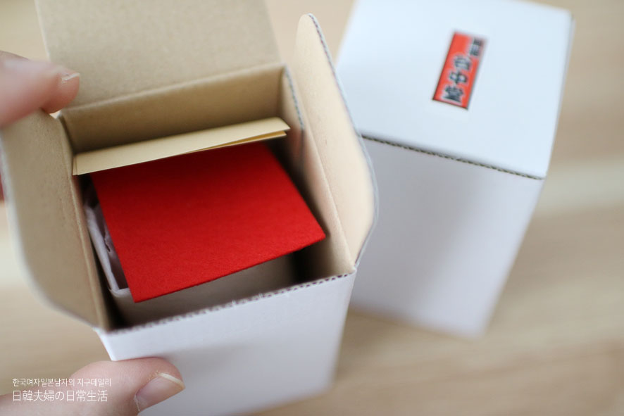마네키네코 사이즈에 딱 걸맞는 상자 안에 명함과 설명쪽지, 손상이 안되도록 잘~ 포장된 마네키네코, 그리고 저 빨간 부직포 같은 천은 마네키네코용 방석 (자부동) 입니다.