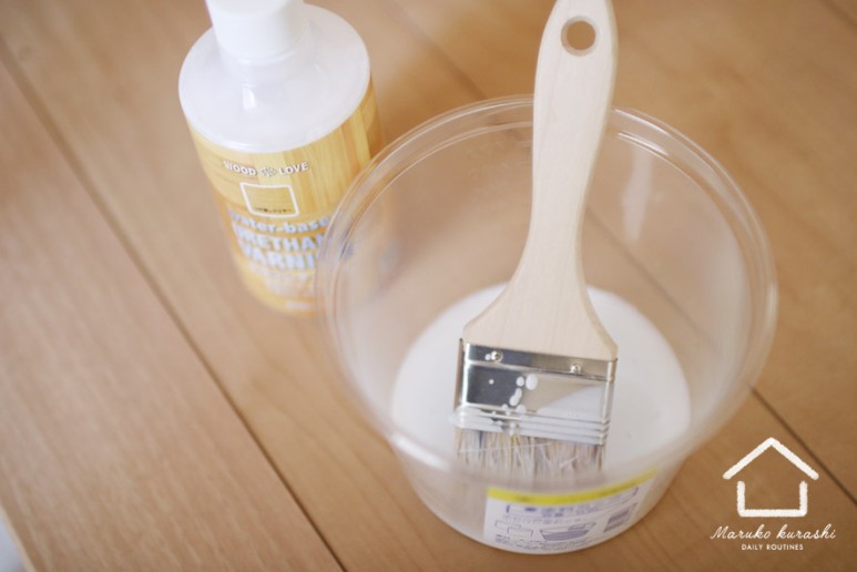 일정 양의 바니쉬를 작업통에 담고 밖으로 들고 나갑니다.