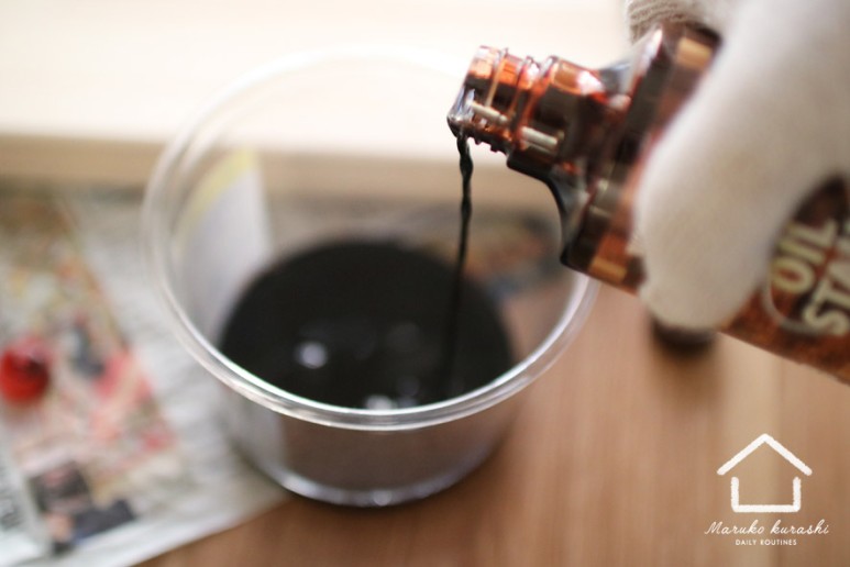 먼저 컬러 오일을 작업 케이스에 일정 양을 담아 나무를 칠해주는 작업을 진행했어요.