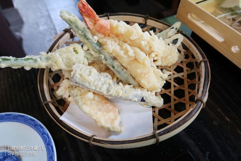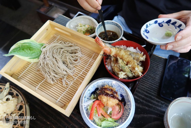 저희는 따로 튀김을 주문했지만, 남편 메뉴안에는 이미 아담한 양의 튀김이 얹혀있는 소바와함께 먹을 만큼의 적당한 사이즈의 텐동이 나오더라구요. 아기자기한 샐러드 위에는 고로케가 하나 얹혀져있고, 이거 만으로도 배부를텐데, 함께 주문한 튀김. 괜찮겠어? ㅎㅎㅎㅎ