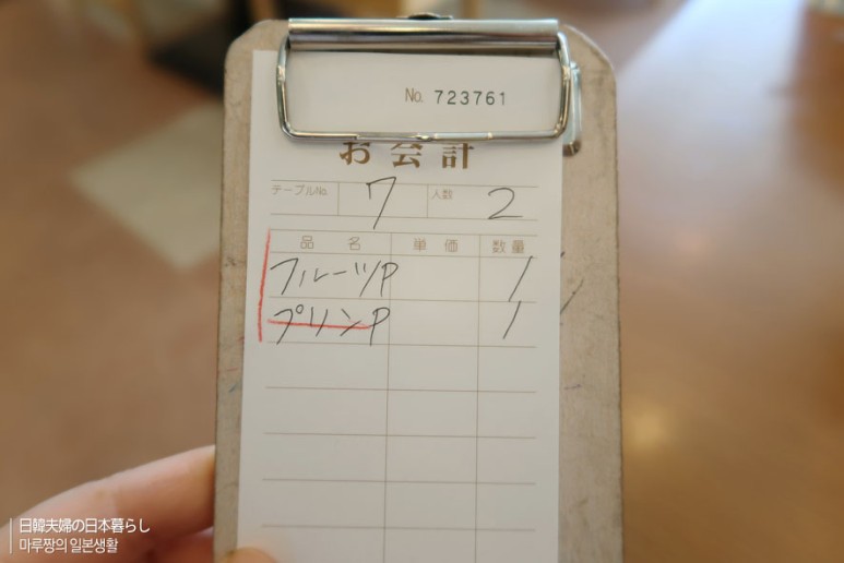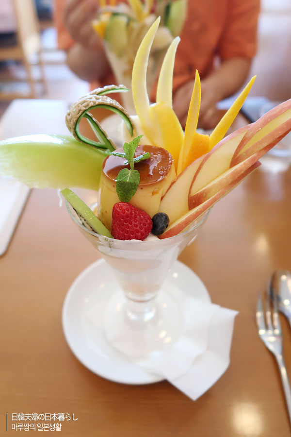 저는 파르페 중앙에 귀여운 푸딩이 뙇- 하고 엎어져있는 먹음직스러워보이는 푸딩파르페(850엔)와, 남편은 후루츠 파르페 (850엔) 를 주문했어요.
