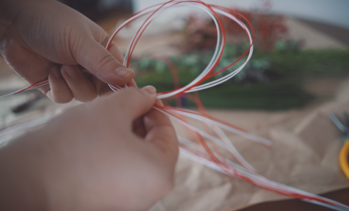 아마존이나 라쿠텐 등에서는 금색, 은색 , 파스텔계열등 수많은 끈들을 쉽게 주문하여 받아볼 수 있었는데요, 꽃집에서 추천 재료들을 사면서 받은 붉음색과 흰색 줄 만으로도 충분히 만족하여 만들기를 진행하였습니다.