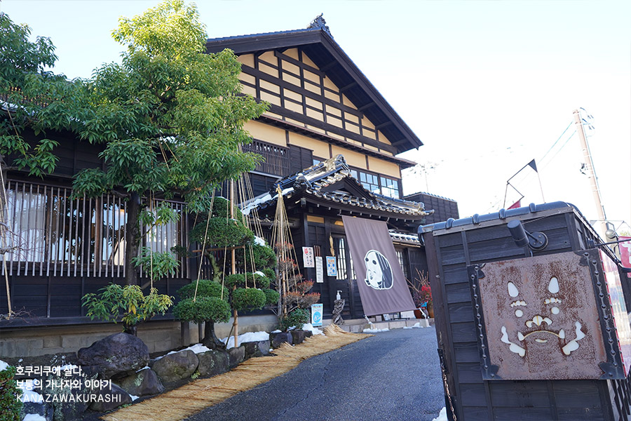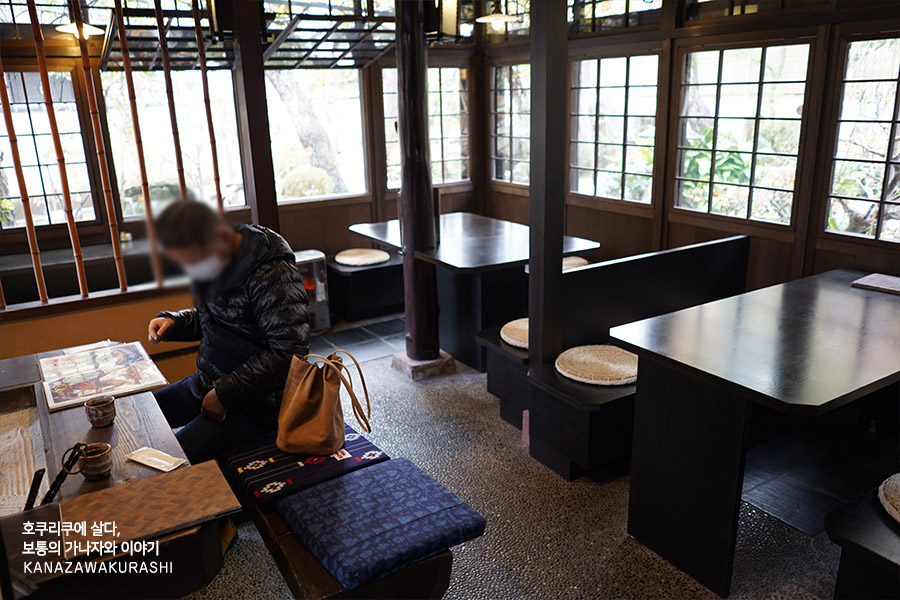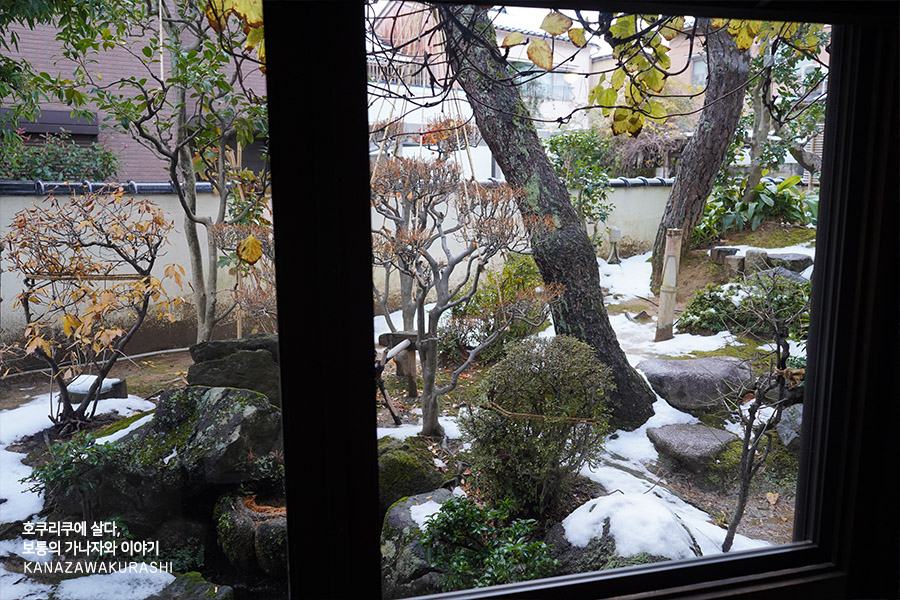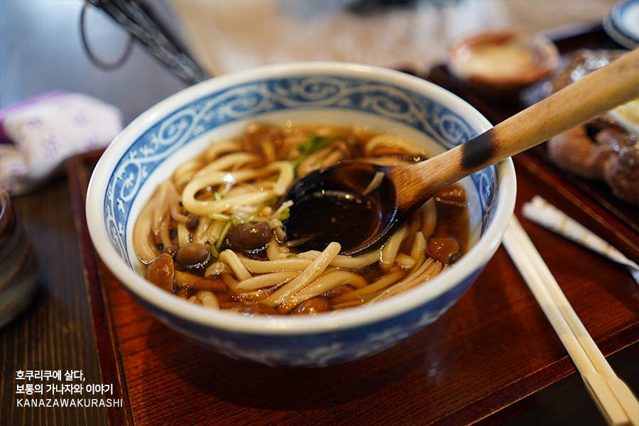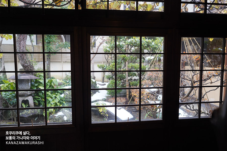 추운 날씨 속에서도 푸른 잎을 뽐내는 겨울 나무들과, 가나자와의 매력인 "유키즈리"가 설치된 나뭇가지들 등등, 고즈넉한 오래된 고민가(古民家)에 앉아 이토록 아름다운 자연의 느낌을 눈에 담으며 먹는 우동의 맛은, 어쩐지 후덥지근했던 여름날의 시원한 에어콘 바람을 맞으며 먹던 시원한 냉 우동과는 전혀 다른 느낌이었습니다.