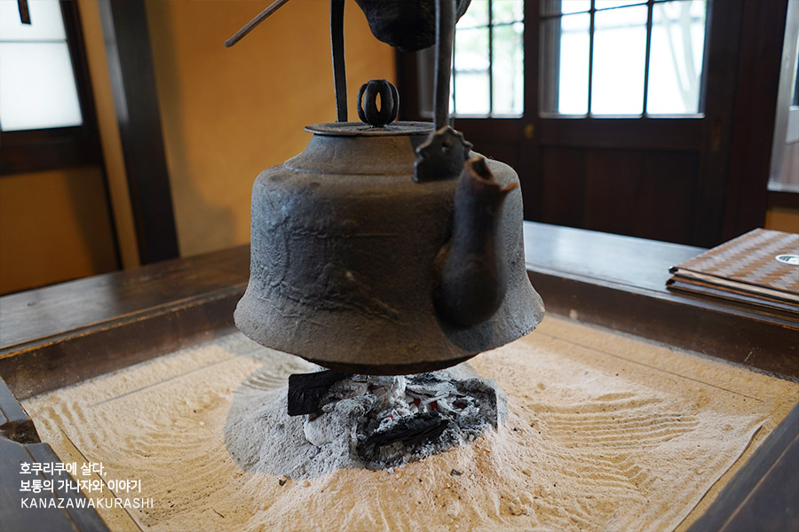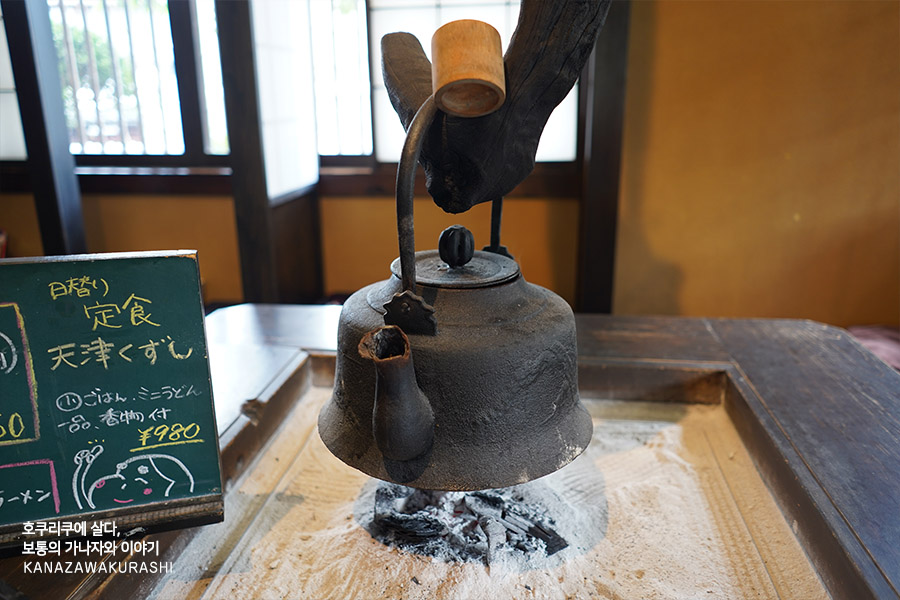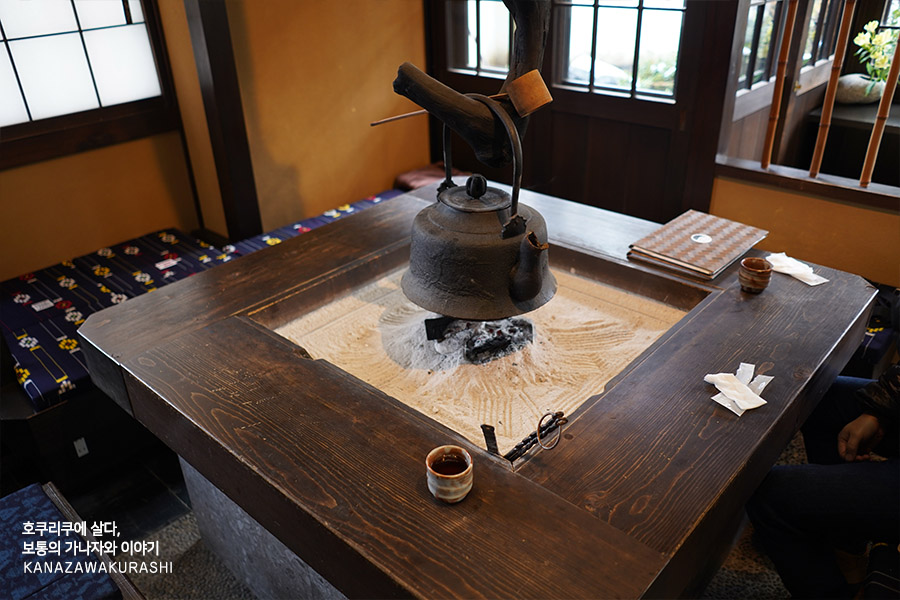 1층의 창가좌석 이외에는 이렇게 정 중앙에 사각형의 이로리 테이블이 준비되어있습니다. 역시나 여름에는 그저 고정시켜두고 사용하지 않았던 큰 주전자가, 현재에는 뜨거운 물이 끓여지며 뚜껑 사이로 뜨거운 김이 조용히 흘러나오고있었어요.