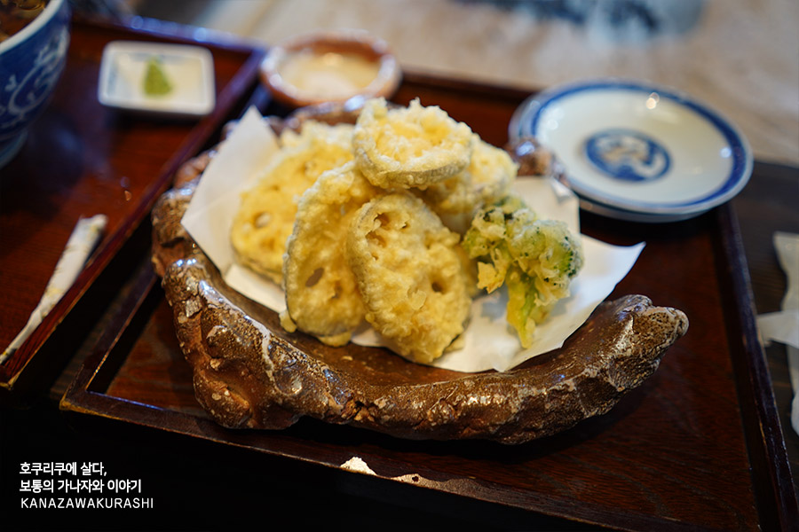 오늘 조금만 돈 더 쓰자, 하면서 계절 야채 튀김을 추가 주문하였어요 (웃음) 제공된 계절 야채 튀김은 바로 "연근" , 연근이라하면 제가 다소 늦은 나이부터 즐겨먹기 시작한 야채중 하나인데요. 어릴때에는 먹기를 꺼려했지만 나이가들고 좀더 성인이될수록 섭취하는 야채들 중, 달짝지근하게 조려진 연근조림부터 피클타입, 그리고 그냥 물에 데치거나 도시락 반찬을 만들때에는 바로 버터에 구워 후추나 소금으로 조금 간을 한 버터구이까지 요즘에는 참 다양하게도 연근을 섭취하고 있습니다.