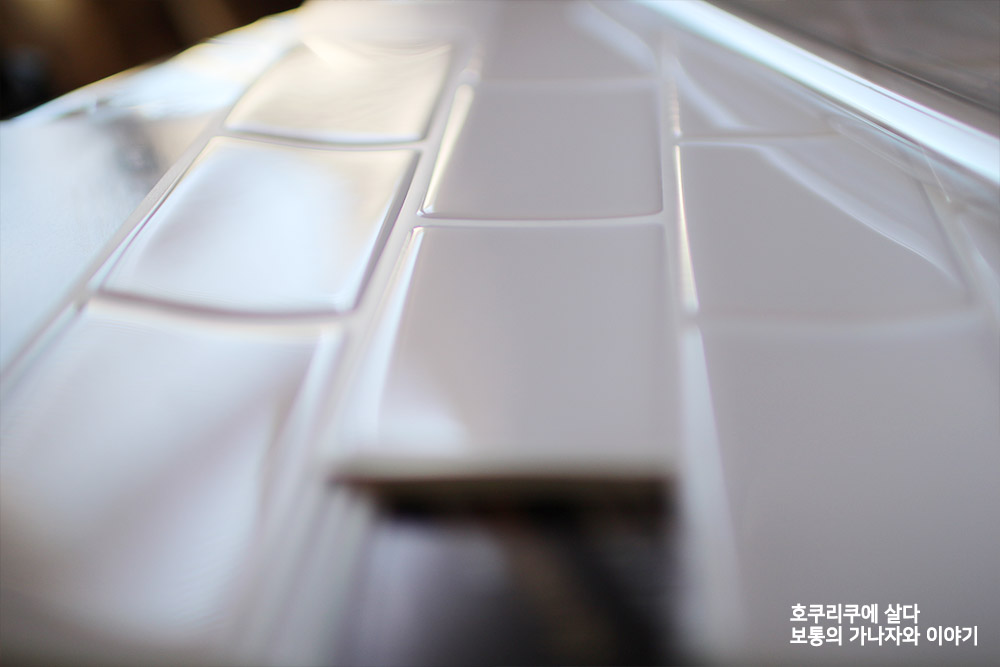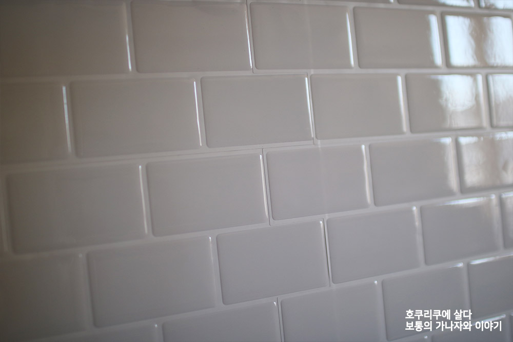 물로 닦으면 물기 자국이 남는 그런 타일이었고, 손으로 매끄럽게 쫙- 바르기엔 빠드득- 거리며 뻑뻑한 타입의 광택 엠보싱 표면, 다들 예상되시나요? 그래서 반대로 주방에 더더욱 어울리고, 기름이 튀기거나 양념이 튀겼을때에 편하게 세제나 물기가 닿아도 별 탈이 없는 방수타입의 타일이었습니다. 사실 요녀석, 가까이보면 흰색처럼 보이지만, 은그슬쩍 아주 조금 하늘빛이 돈답니다.