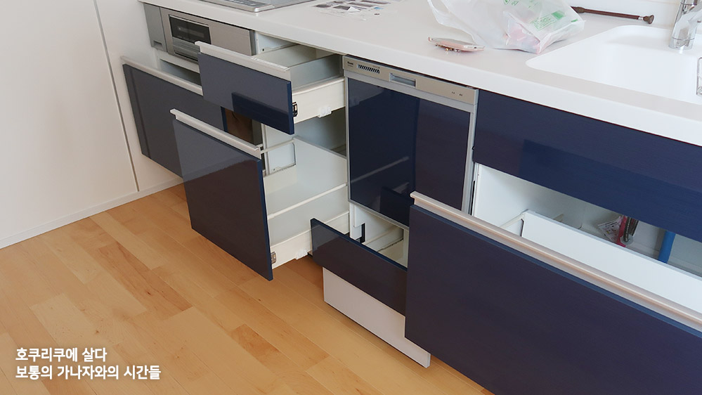 주방의 폭은 이전 집보다 아주 조금 더 넖어진듯하여 동선에는 좀더 여유가 생기게되었습니다. 일본의 부엌은 한국 부엌보다 좁다는 인식이 크게 작용하는 것 같습니다. 물론 집의 평수, 그리고 설계 레이아웃 및 부엌구성의 스타일에따라 천차만별로 입에 오르내릴 테마입니다만