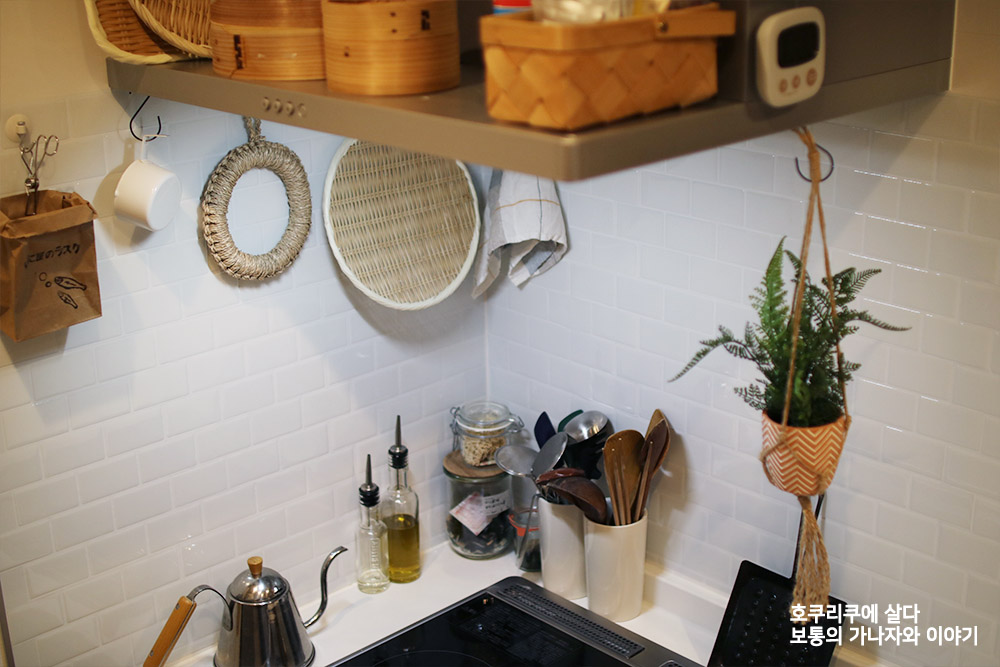 워낙 벽면이 하얗다보니 압정 하나 박고 떼어내면 까만 점이 너무나 선명하게 보여 손톱으로 긁어보며 덮어내기 바쁘게되었지만, 조금씩 손볼 수 있는 곳부터 천천히 저만의 스타일로 저만의 주방을 만들어가는데에 조금 욕심내 보았었던 지난 한달이었습니다.