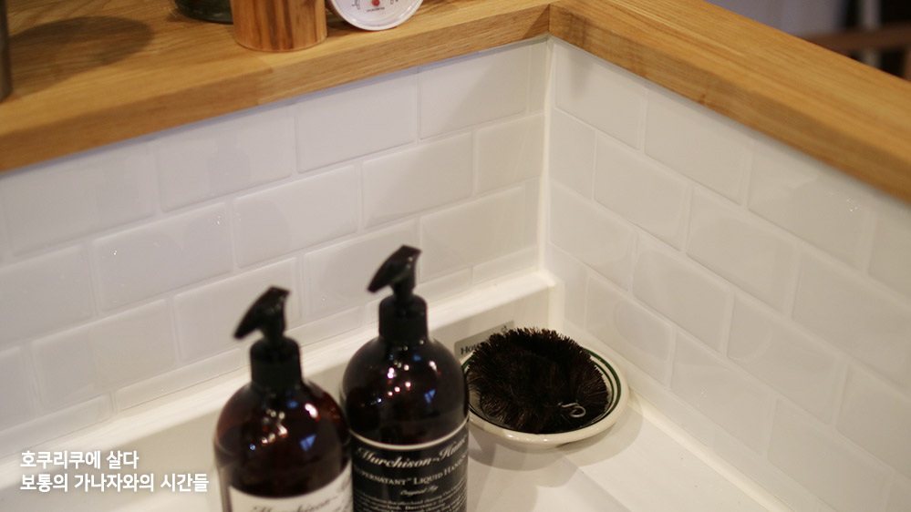 이사한 집은 부엌 가구의 컬러가 네이비, 그리고 화이트계열이었습니다. 천연 목재역시 부착되어있는 디자인이었습니다만, 매번 요리를 하면서는 반들반들한 광택이나는 벽을 바라보곤 했었지요. 그리고 조금은 지루해지기 시작했습니다. 언젠가 정말 우리집을 갖게된다면 벽면에 타일을 붙여 인테리어 리폼을 하고싶다는 생각이 있었습니다.