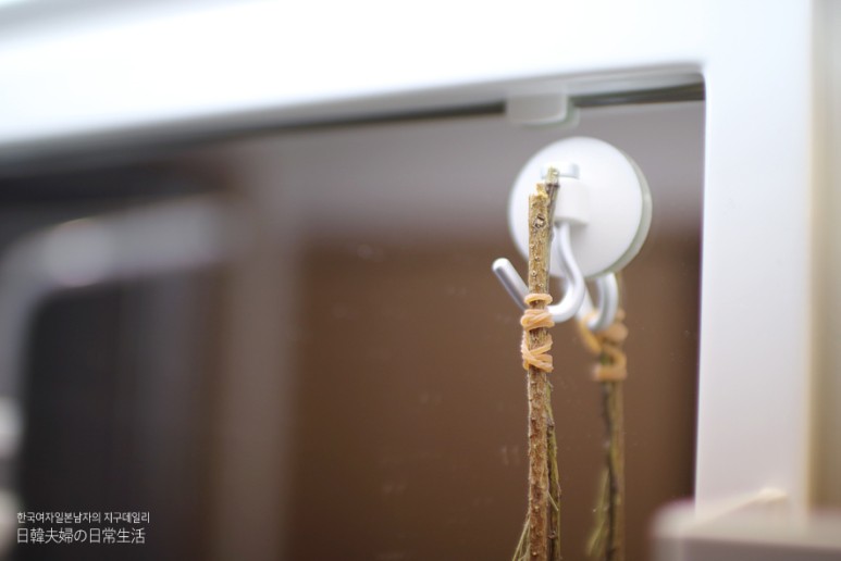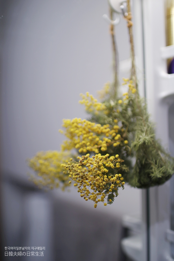 얼마전에 식탁에있던 드라이플라워 꽃들을 두개로 나눠, 세면대 거울과 주방에 각각 나눠 메달아 두었어요. 처음에는 좀 갬성적인 마스킹테이프로 삐딱하게 붙일까, 싶다가. 끈적이는거 자체가 유리나 벽에 붙는게 싫은 성격에, 고무줄로 대충 묶어서 걸어버렸어요. (웃음)