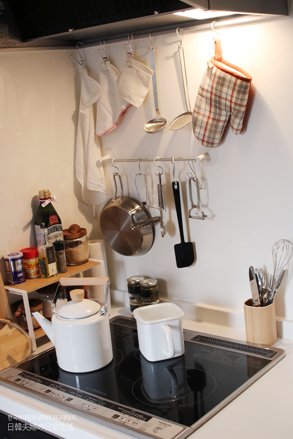 무인양품의 알루미늄 수건걸이 빨판을 이용해서, 벽면에 부착했고. 다양한 주방 용품들을 S자 고리에 연결해 걸어봤어요. 정말 매일매일 딱 사용하는 아이들만 꺼내 쓰기 편한 위치에 걸어두었답니다.