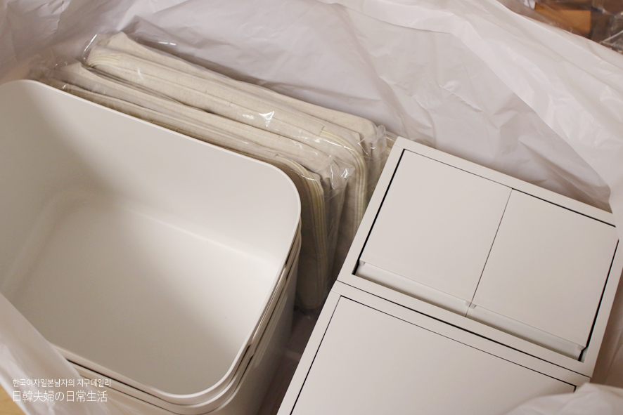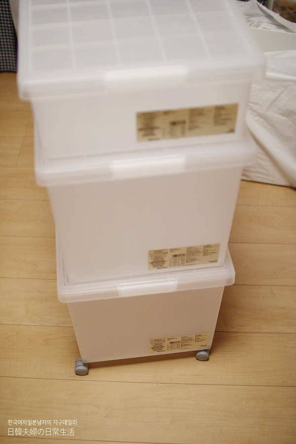 왠만한 옷가지들이나 짐은 겨우 한국에서 다 처분하고 왔다 한들, 그래도 꽤 옷의 종류도 되기때문에, 일단 테스트겸 3개정도만 구매해본 무인양품 폴리 프로필렌 박스입니다. 반투명에 무광택감의 박스가, 좀더 깔끔하고 안정감있는 인테리어에 1점 더해진 것 같습니다.