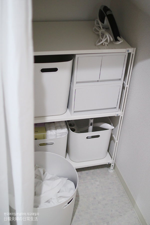 처음 이 집에 이사왔을때, 란도리룸겸 세면대가 존재하는 이곳에, 이렇게 큰 창고같은 공간이 있어서 정말 놀랐어요. 왼쪽 안쪽으로는 딱 2배정도되는 더 깊숙한 공간이 있는데, 일단은 가장 가까운 , 창고의 커튼을 젖혔을때에 보이는 손이 닫기 쉬운곳에