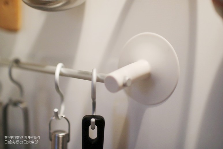 니토리에서 구매한 , 애정템인 저 프라이팬을 걸었는데도, 꽤 튼튼하게 문제없이 걸어둘 수 있어요. 벽면이 유리처럼 되어있기때문에 무인양품의 알루미늄 수건걸이 "빨판" 타입으로 무난하게 부착 성공입니다.