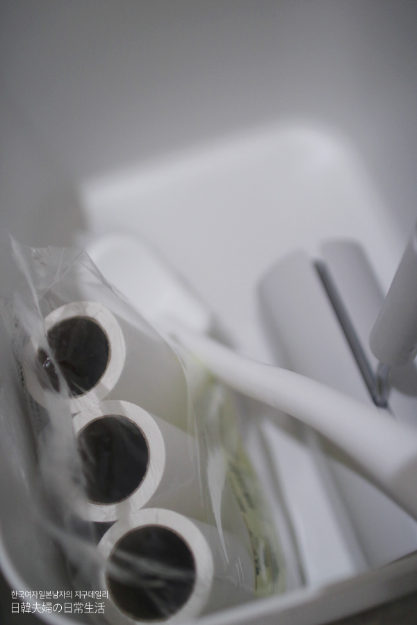 박스 안에 들어있는것은 무인양품의 카펫 청소기(돌돌이) , 그리고 돌돌이 테이프 여유분, 청소 브러쉬 등이 들어있어요. 앞서 말씀드린바와같이 폴리에틸렌 케이스는 물에도 강하기때문에 , 조금의 물이라도 감당해주는 편리한 제품을 찾다보니, 모양상으로도 딱 떨어져 구매하게 된 케이스고 그 안에 다야한 청소도구를 손쉽게 꺼낼 수 있도록 넣어뒀습니다.