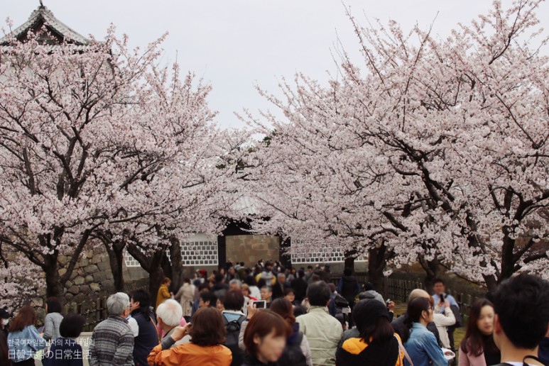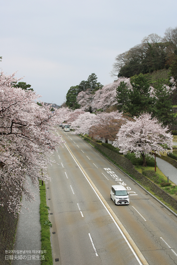 가나자와 성에 들어가는 다리에서 찍어본 저 아래편 벚꽃 도로~! 이 한장 찍기가 얼마나 힘들었는지, 주말도 주말이거니와 무수히 많은 관광객들에 둘러쌓여 몸을 숙이고 다리 철물 사이로 렌즈를 쏙 넣어 셔터를 눌러봅니다.