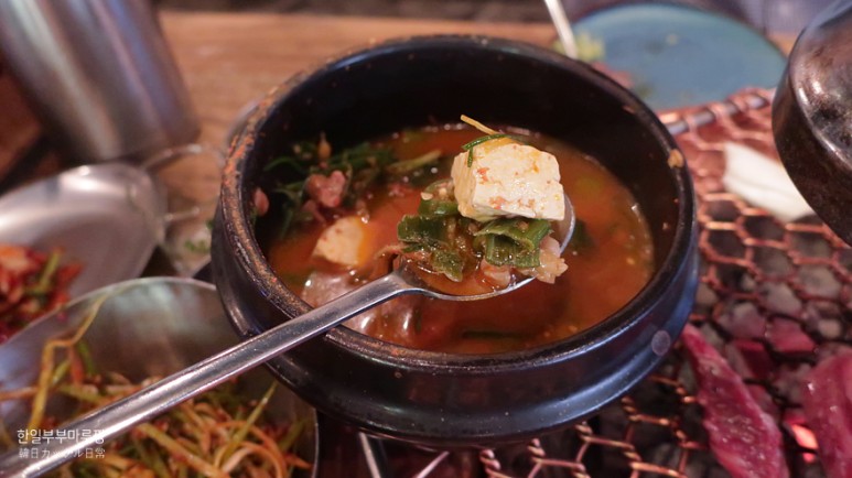 아, 그리고 국물까지 모두 마셔버렸던, 도마의 "마약된장찌개", 이곳은 된장 찌개가 나오면 정말 굿 쎈스로 구이판 위에다가 살포시 얹어주세요. 그러니 계속해서 따끈따근하게 먹을 수가 있는거거든요. 마루짱은 이런 센스가 너무 좋아요. 다른데는 뚝배기 손상된다, 불판 손상된다, 타니까 내려놔라, 설겆이 하기 어렵다, 라는 다소 고객입장에서 기분이 상할 수 있는 말을 꽤 하면서 뜨거운곳에 뚝배기 올려놓는것 제제하는 곳이 있어요.