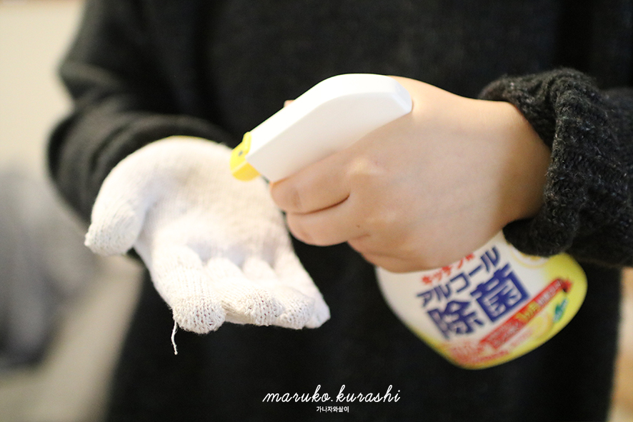 청소 방법은 제균 스프레이를 목장갑을 낀 손바닥에 도포해주고