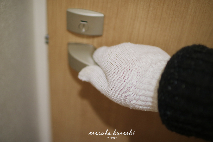손이 닿을만한 손잡이, 문고리 모든곳을 제균 스프레이가 충분히뿌려진 목장갑을 통해