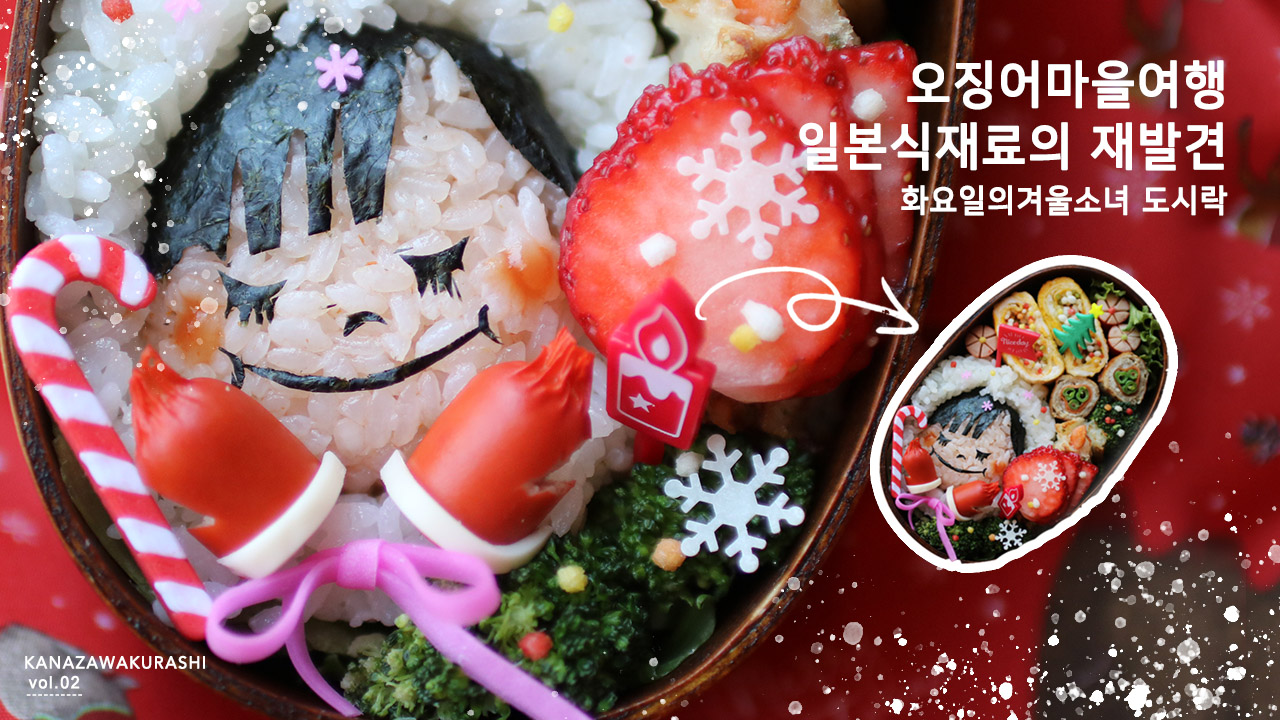 추운 겨울이 시작되면서 붉은 색감이 따뜻하고 포근한 겨울을 연상시키는 귀여운 도시락을 만들고싶다는 생각이 들었습니다. 100엔숍에서 구매한 크리스마스 도시락 픽들, 그리고 주문한 기타 도시락픽들이 도착함과 동시에 그것에 어울릴만한 테마의 도시락들도 머릿속에서 떠오르기 시작했어요. 푸근한 패딩 모자를 푹- 눌러쓴 볼이 빨간 손모아장갑을 착용한 겨울 소녀의 캐릭터로 데일리 남편 도시락을 만들어 봅니다.