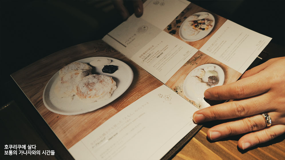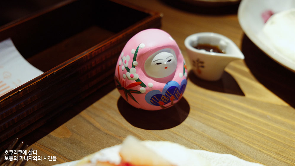 테이블에 앉고 주문을 시작했을때에는, 작고 귀여운 카가인형(加賀人形) 이 테이블 위에 올려집니다. 이는 테이블 계산을 할때에도 레지에 가지고 가서 계산을 해야합니다. 하나의 작은 룰. 그리고 제공되는 따뜻한 차를 마시며 팬케이크를 기다립니다.