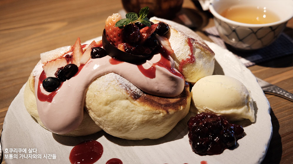사진을 찍힌 메뉴는 딸기크림과 소스, 신선한 딸기가 제공된 아마도 딸기 한정 메뉴였던것으로 기억이됩니다. 늘 있는 메뉴가 아니라 그 시즌에만 판매하는 계절 한정 메뉴였습니다. 또다른날에 방문해서 주문한 메뉴는 초록키위와 붉은 딸기, 블루베리등이 각각의 색과 어울리며 참으로 먹음직 스러웠었던 "加賀藩前田家伝来五色フルーツのパンケーキ" 오색과일 팬케이크,