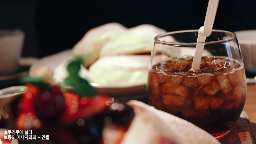 우연찮게도 방문할때마다 늘 1층의 테이블 좌석에 앉아 주방을 마주보며 식사를 하게되었었어요. 어느정도 산미를 머금고 있는 아이스커피는, 산미를 그다지 좋아하지않는 늘 이탈리안 로스팅 커피를 즐기는 저에게 "달콤한 디저트를 먹을때에는 어느정도 유일하게 허락될 수 있는 커피" 로 최근 인식되고있어요. 여담입니다만 남편은 산미가 들어간 "삿빠리" 한 커피를 즐기고, 저는 무척 구수하고 진한 향의 커피의 마지막 단계라고도 이야기되는 이탈리안 원두만 고집하고있는 , 서로 원두의 종류로 싸울일 없는 취향의 부부. 입니다.