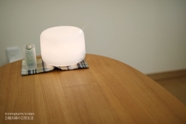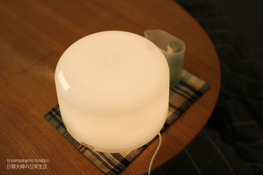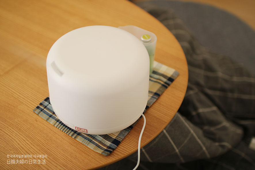 디퓨져는 현재 코타츠의 테이블 위에 놓여있는데요, 코타츠 상판이 아무래도 목재이기때문에, 기존 무인양품의 공지에도 기재되어있지만, 물과의 오랜 접촉이 있으면 목재가 손상될 수 있는 것으로 주의를 기울여야할 것 같아요. 때문에 수분이 뿜어져나오는 입구부분을 벽쪽과 테이블 목재부분을 향하지 않는 쪽으로 돌려두게 되더라구요.