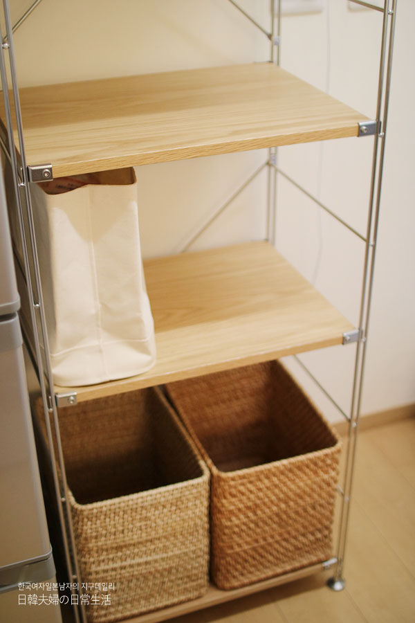 지난번 유닛 선반을 주문하면서 함께 미리 구매해두었던 나무꽈임의 라탄 직사각형 바스켓(사진 좌측 나무상자) 도 함께 넣어봅니다. 간단한 라면, 과자 등 입가심거리의 먹거리들을 넣어도 참 좋겠다. 라고 생각하고 있습니다.